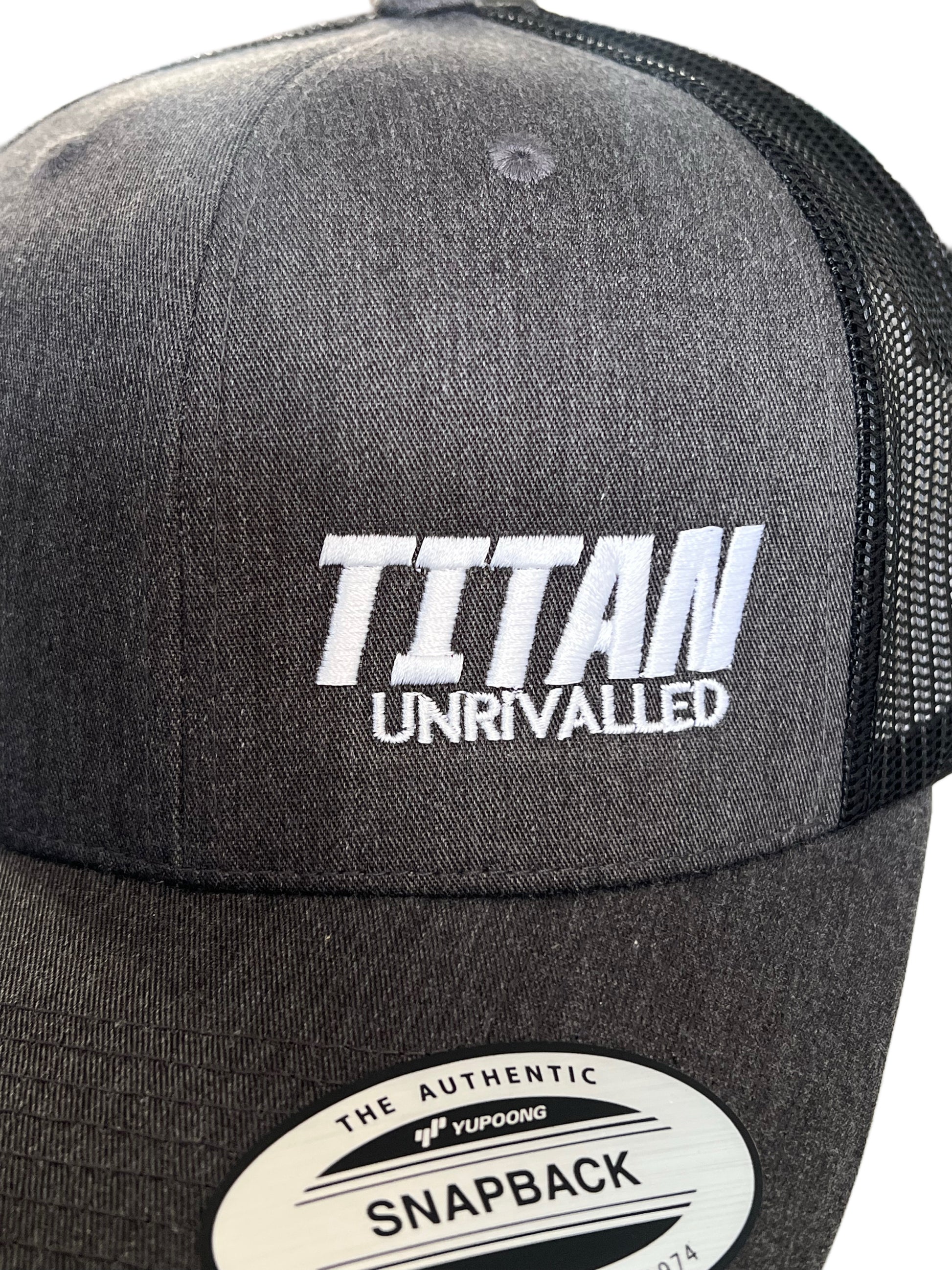 The TITAN Essential Trucker Cap features a white embroidered signature TITAN on the front panel, with a dark heather grey front and black mesh back. One Size Fits All with a snapback closure.